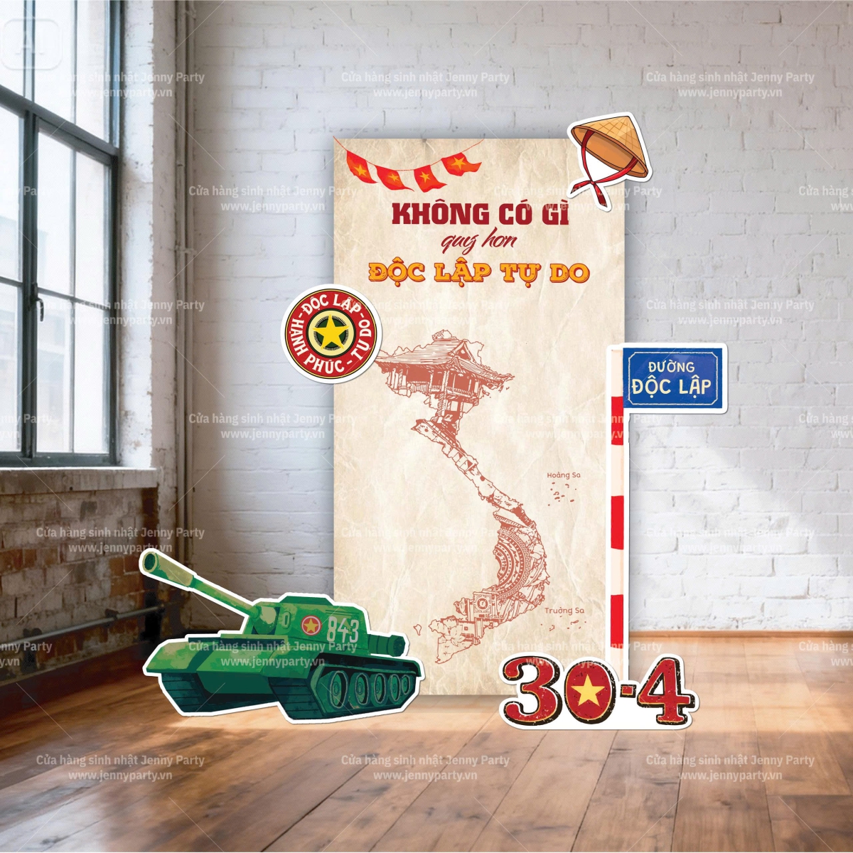 - Các chi tiết trang trí: xe tăng, nón lá, bảng “Đường Độc Lập”, biểu tượng huy hiệu